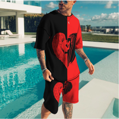Conjunto corto casual de manga corta con cuello redondo impreso en 3D para hombre
