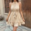 Falda de cuello alto y cuello alto medio Vestido de color sólido de jacquard con cordones